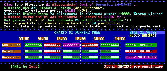 Dal luned́ al venerd́: Running FREE risponde dalle 00:00 alle 09:00 e dalle 20:00 alle 24:00; inoltre, dalle 13:00 alle 15:00, la bbs risponde in modalità mail-only per i point. Sabato: risponde dalle 00:00 alle 09:00 e dalle 13:00 alle 24:00 Domenica: risponde 24 ore su 24.